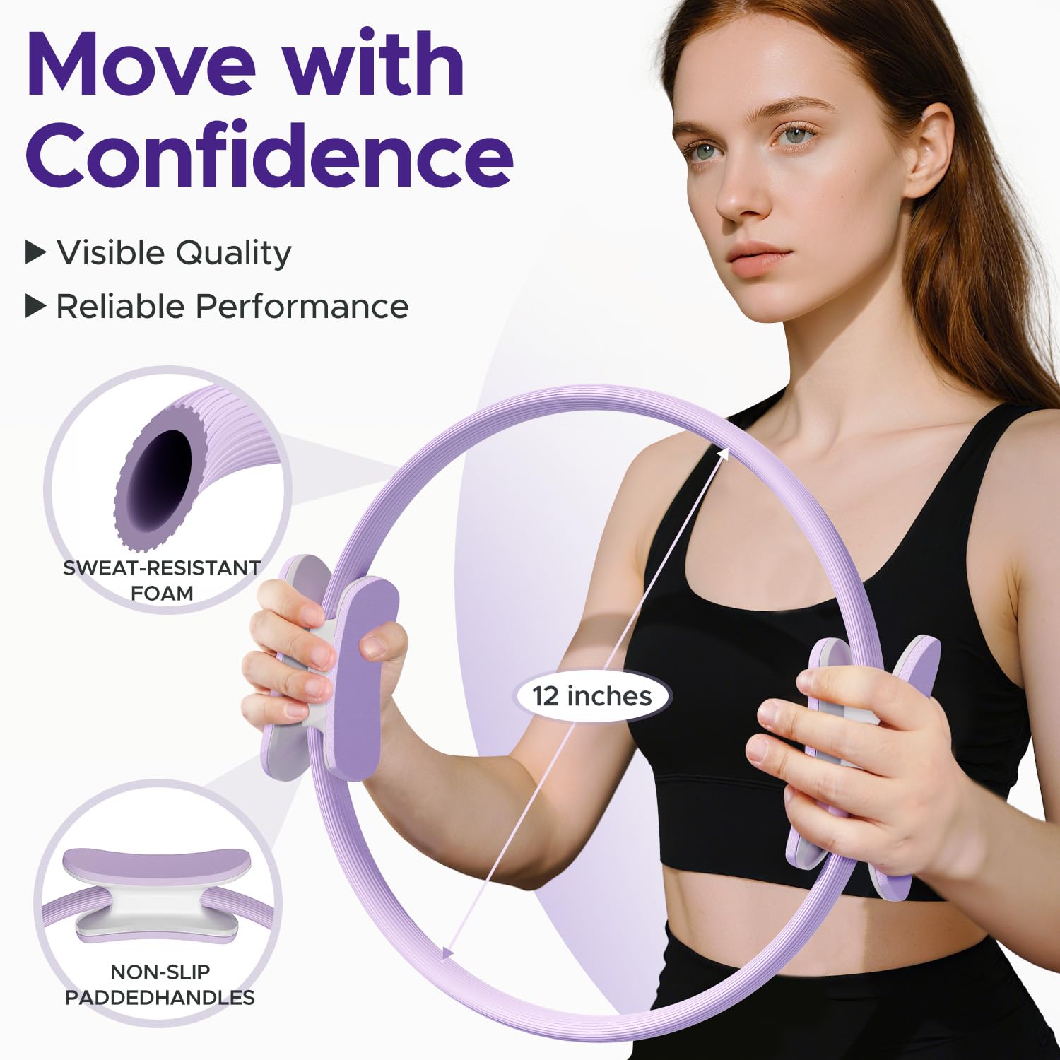 - Durable & Comfortable Magic Circle: Made with high-grade fiberglass and encased in a thick rubber shell, the 14-inch Pilates Ring offers optimal resistance, flexibility, and durability. The dual-sided foam-padded handles (7mm thick) ensure a firm yet comfortable grip, allowing precise control during every move—perfect for legs, arms, and core toning exercises.